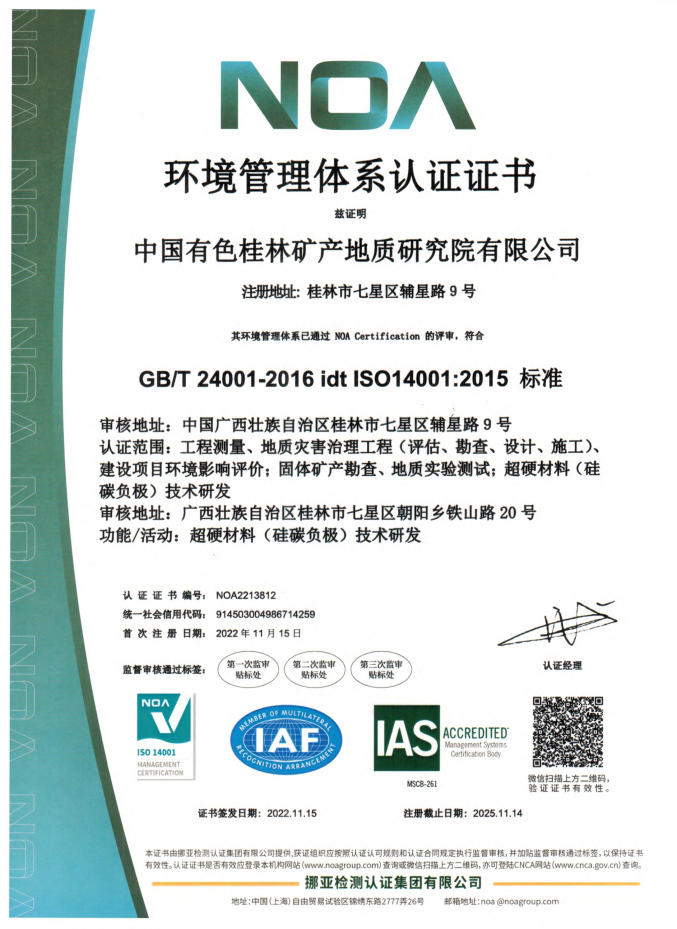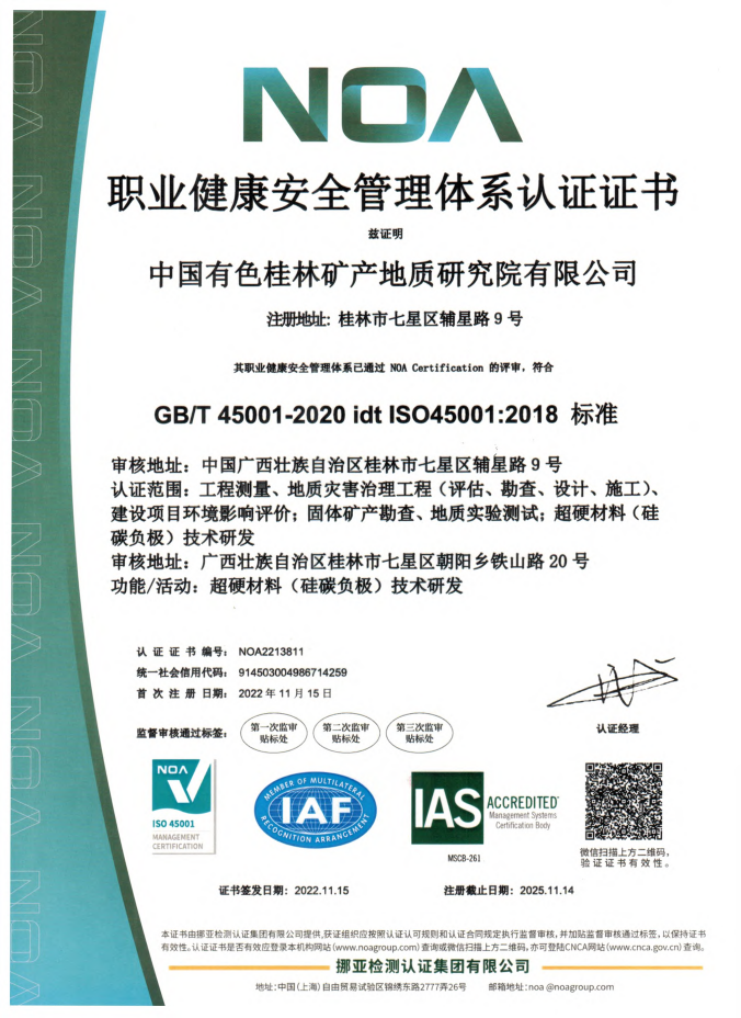 近日,中國(guó)有色桂林礦產(chǎn)地質(zhì)研究院有限公司(簡(jiǎn)稱:中色桂林院)順利通過ISO14001環(huán)境管理體系及ISO45001職業(yè)健康安全管理體系認(rèn)證審核,并取得體系認(rèn)證證書,標(biāo)志著中色桂林院在環(huán)境保護(hù)、員工職業(yè)健康安全、低碳經(jīng)濟(jì)等方面邁上新的臺(tái)階,企業(yè)全面規(guī)范化管理得到進(jìn)一步強(qiáng)化與提升。