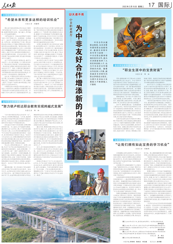 2022年2月15日出版的《人民日報》刊發題為《中非職業教育——為中非友好合作增添新的內涵(大道不孤)》文章,對中國有色集團推動我國職業教育“走出去”情況進行了報道(鏈接:http://paper.people.com.cn/rmrb/html/2022-02/15/nw.D110000renmrb_20220215_1-17.htm)。以下為報道全文: